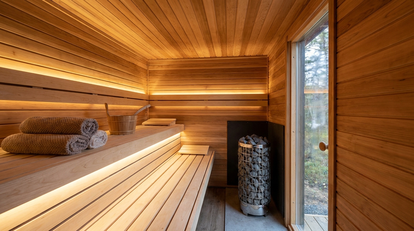 Empfohlene Kombination: Nordische Fichte für Wände und Decke (günstiger, gute Isolierung), Espe für Bänke und Liegen (kühl bleibend, hautfreundlich). Bei guter Pflege hält eine Saunakabine 20 bis 30 Jahre.